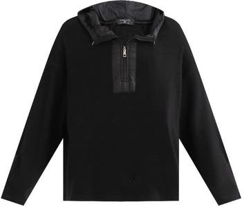 Designed for effortless layering, this black sweater combines sleek structure with cozy texture. The ribbed body and sleeves add subtle dimension, while the smooth hood and zipper placket offer a clean contrast. Ideal for transitional weather or casual outings with a refined edge. Half-zip front allows adjustable coverage and styling versatility. Mixed textures elevate the minimalist silhouette for everyday polish.