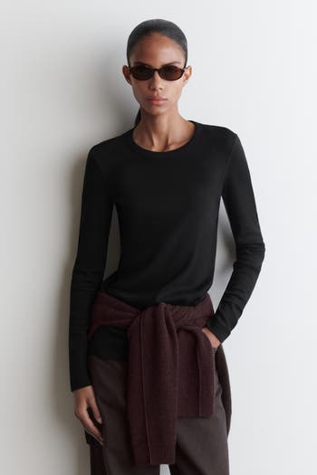 Crafted from stretchy organic cotton, this ribbed jersey staple has a classic round neck and long sleeves. An exposed overstitched seam runs along the back of the garment for a neat finish.