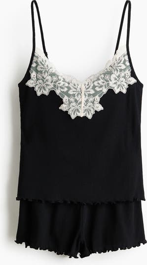 Pyjamas with a top and pair of shorts in soft, ribbed jersey. Top with a lace-trimmed V-neckline, narrow, adjustable shoulder straps and an overlocked hem. Shorts with covered elastication at the waist and overlocked hems.