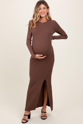 Embrace comfort and style with our Olive Ribbed Knit Long Sleeve Side Slit Maternity Maxi Dress. Crafted from a soft, stretchy ribbed knit fabric, this dress gently hugs your growing bump while providing all-day comfort. The elegant olive hue is perfect for any season, and the side slit adds a touch of sophistication and ease of movement. Long sleeves and a classic crew neckline make it a versatile choice for casual outings or dressier occasions. Whether you're expecting or nursing, this maxi dress offers a flattering fit and effortless style throughout your maternity journey.