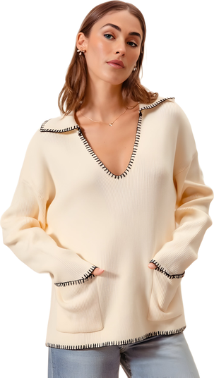 A cozy classic with a refined twist, this long sleeve pullover from Knit & Lounge features a deep V-neckline and ribbed texture throughout. The contrast whipstitch trim adds definition and a modern edge to the soft silhouette, while front patch pockets offer both function and charm. Designed to drape beautifully over your frame, it's the perfect layering piece to elevate your off-duty or on-the-go ensembles with ease and comfort.
