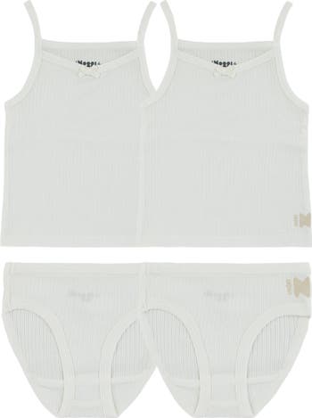 This two-piece underwear set includes a camisole and panties, featuring a ribbed pattern and small bow detail on the camisole neckline.