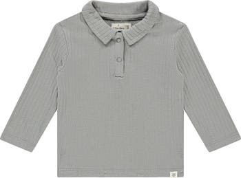 This steel grey-toned ribbed texture long sleeve shirt features a polo style collar and two button enclosures below the center of the neckline.