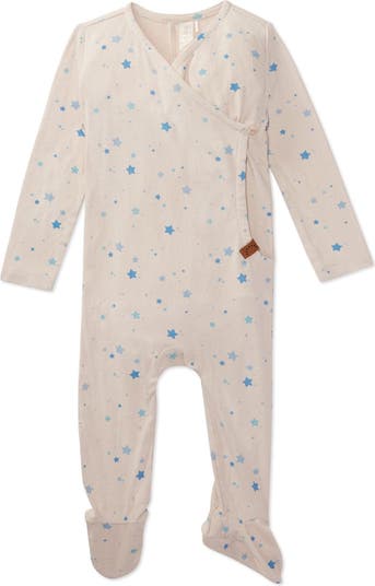 Seeking stellar everyday playwear for your pint-sized superstar? Check out this star-studded footie. It comes in silky-soft plant-based rayon -- ribbed for flexible stretch -- with just enough spandex for shape-keeping custom fit. Plus, it's loaded with laid-back features, from the breezy crossover neckline to the one-button left-side closure.