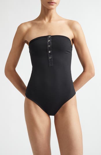 A buttoned placket with silvery buttons centers this sporty strapless swimsuit made from high-stretch recycled-nylon ribbing and cut with moderate back coverage.