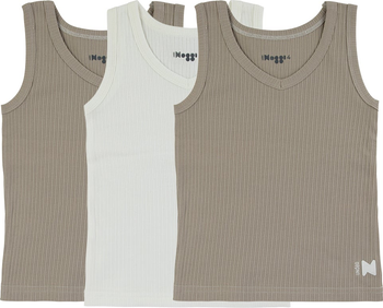This set includes three ribbed tank tops in taupe and off-white, perfect for layering or wearing alone.