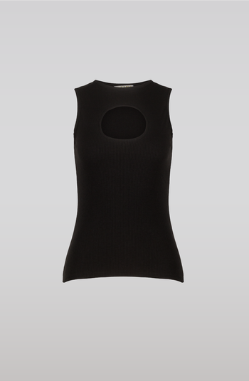 Sleeveless fitted rib top with cutout on chest. This top is true to size. The model is wearing S and is 172 cm.