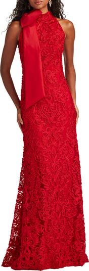 Stun at your soireé wearing this glamorous figure-skimming gown made in a fiery hue and adorned with swirling soutache lace. A lavish bow is the cherry on top of this delicious look.