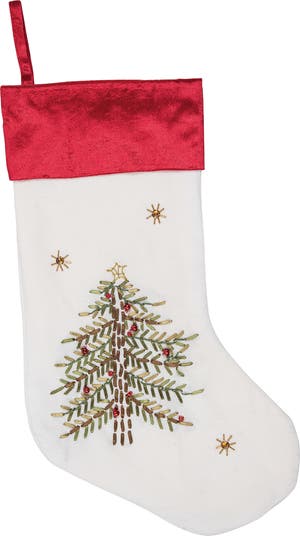 Begin an elegant tradition with the Christmas Tree Stocking. With a striking red and white color way, a centric embroidered pine tree brings a classic, yet lovely element to your holiday. Cute and small golden floating stars on top of the embroidered tree and a satin red boot top makes this stocking quite festive yet minimalist. It will get stuffed with lots of toys and candy for sure this upcoming season!