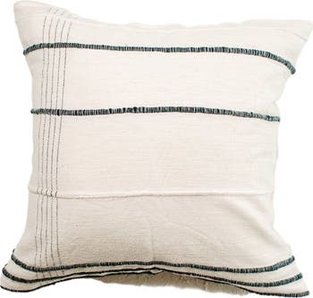 Woven from hand-spun cotton with beautiful navy blue accents, this decorative throw pillow adds depth and timeless elegance to any room. Each has a rich texture and luxurious softness that comes only from handwoven natural fibers. Pillow cover measures 18 x 18" with a zipper closure and inner cotton lining. Each comes filled with a pillow form made in the USA with a high thread count covering and hypo-allergenic polycotton filling. Machine wash and dry. Please note that the pattern of each pillow will very slightly making them all uniquely beautiful.