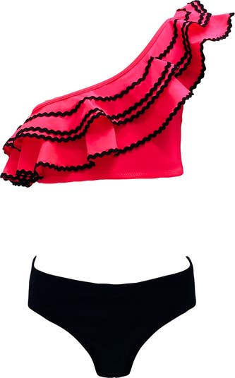 Get ready to make a vibrant splash in this stunningly chic one-shoulder bikini. Bursting with energy, this set features a dynamic asymmetrical top in a brilliant electric pink. Cascading tiers of ruffles dance across the shoulder, each one meticulously defined by a sharp, graphic black zigzag (ric-rac) trim that adds a pop of edgy contrast.