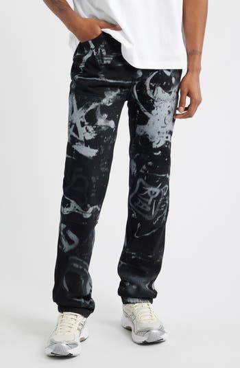 Graffiti graphics make a bold impact on these slim-fitting jeans detailed with signature crosses at the front pocket and back pocket.