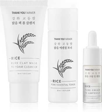 - Rice Pure Clay Mask To Foam Cleanser] 1.05 fl oz (30 ml) Formulated with rice extract sourced from a clean area, this cleanser gently washes away dirt and facial impurities while helping provide soothing sebum care for skin that looks clear and glowing. [Rice Pure Essential Toner] 1.05 fl oz (30 ml) A highly concentrated hydrating toner that delivers nourishing moisture for skin in need of soothing, comforting hydration. [Rice Pure Cream In Ampoule] 0.35 fl oz (10 ml) Featuring a dual-layer formula with rice extract sourced from a clean area, this ampoule helps improve the look of skin tone while supporting firmer, softer-feeling skin.