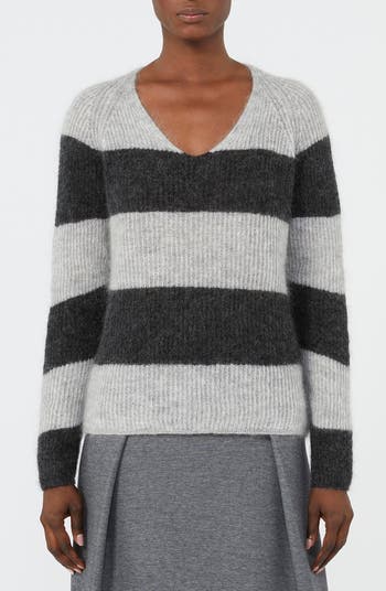 Make sweater weather feel more luxe in this striped V-neck warmed with fuzzy mohair and wool yarns.