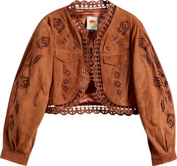Intricate embroidery and scalloped trim bring vintage character to this cropped leather jacket designed with curved seams and chest patch pockets.