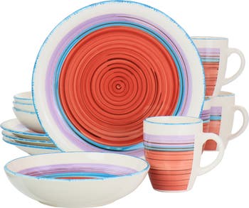 The Gibson Home Richvale 12 Piece Round Durastone Dinnerware Set in Red is a vibrant parade any guest would enjoy. The playful swirl pattern draws attention to the table as each dish displays a pop of color. Great for sprucing up dinning tables. The tableware's durastone construction provides long lasting quality for everyday use. Dishwasher safe for fast and convenient cleaning. This dinner set is ideal for unique lunches, an easy going breakfast, or special dinners.