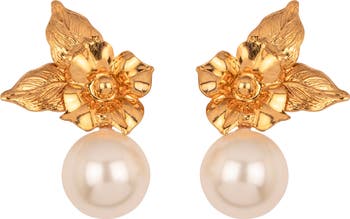 Put an elegant finishing touch on your ensemble with these lustrous faux-pearl earrings blossoming with 18-karat gold-plated floral accents.