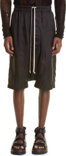 These silky-soft track shorts get designer Rick Owens' signature treatment with an exaggerated dropped crotch and extra-long drawstrings.