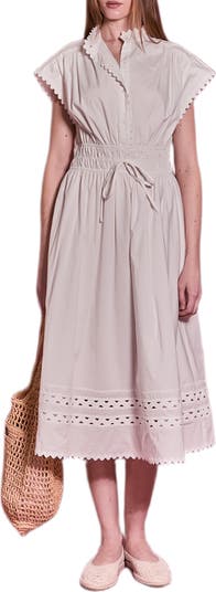 Rickrack trim sweetens this breezy cotton maxi framed by abbreviated dolman sleeves and made with a defining smocked-and-tied waist.