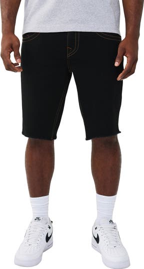 Chunky embroidery frames the seams and brands the back pockets of shorts cut from overdyed black denim left chopped and fraying at the knees. Sitting right at the hips and staying relaxed and straight down the legs, they make an easy-wearing foundation to any warm-weather look.