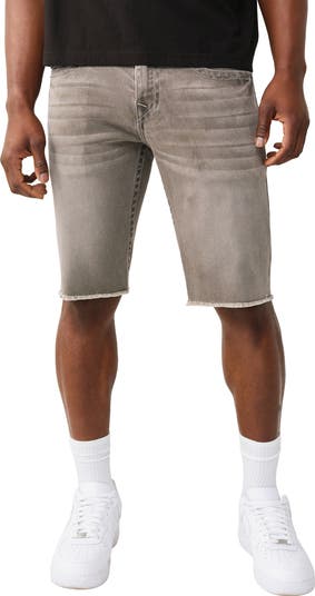 Horseshoe stitching and button-flap pockets bring signature True Religion style to frayed straight-leg shorts made from faded stretch denim.