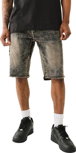 Stand out in straight-leg denim shorts featuring a retro acid wash, frayed hems and bold horseshoe stitching at the back flap pockets.
