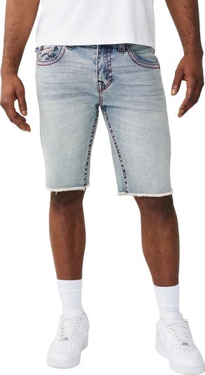 Contrast stitching and button-flap pockets bring signature True Religion style to frayed straight-leg shorts made from faded stretch denim.