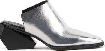 The Ricky Mule Mid features a sleek leather upper and a uniquely sculpted, geometric block heel. This multifaceted, architectural heel adds a touch of futuristic flair and elevates the boot from simple to statement-making, while the open-back design provides effortless slip-on wearability.