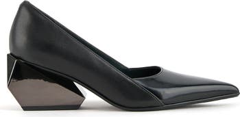 The Ricky Pump Mid offers a sculptural take on a classic silhouette. Featuring a sleek, pointed toe and a refined upper crafted in polished leather and metallics, the Ricky Pump maintains an elegant profile atop a uniquely sculpted, geometric block heel. This multifaceted, architectural heel adds a touch of futuristic flair and elevates these pumps from simple to statement-making.