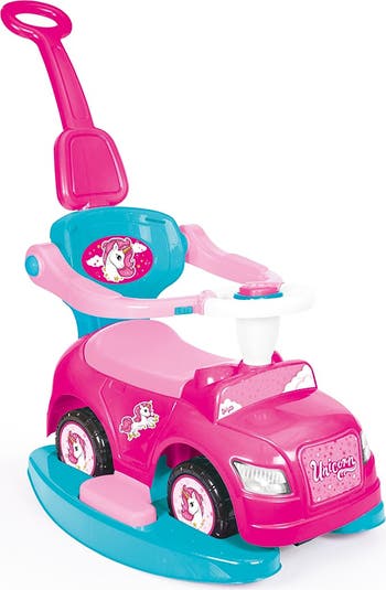WALK & DRIVE STEP CAR: 4IN1 - UNICORN PINK - There's endless fun and functionality in this 4 in 1 unicorn detail Walk and Ride car. Whether you want to walk, ride, rock or drive, this companion is versatile to your growing child's everchanging needs and does so in style... Walk: Ensure the rear adult handle is detached and your tiny tot can use the car as a push along to aid them in taking their first steps, boosting their strength and confidence! Ride: Attach the rear adult handle and give your little one as a rest as you push them around. Rock: Attach the curved stabilizers so your child can rock back and forth. Drive: Give your little racer free reign to whizz around, fueling the car with their feet, navigating with the steering wheel and honking the horn! Product features: Unicorn detail & sound effects to boost the fun! Storage under seat Approximate dimensions: 15.8" L x 11.8" W x 27.2" H (30 x 40 x 69 cm. Suitable for age 12 months +.