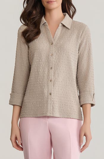 A lightweight and breathable ridge-knit design brings all-day comfort to this button-up shirt framed by three-quarter sleeves with fold-back cuffs.