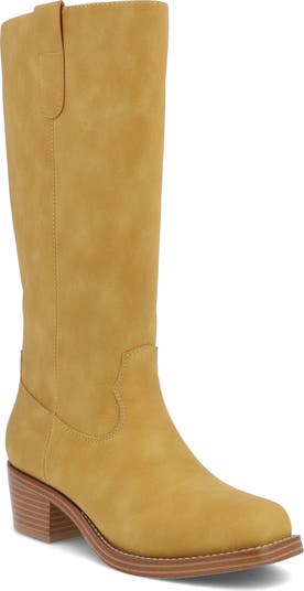 A squared toe is framed by contrast topstitching for a rustic trim to this classic riding-style boot set on a low block heel for a stylish and steady lift.