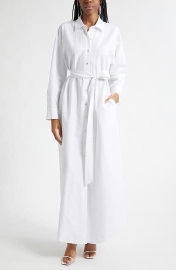 Cut from crisp stretch poplin, this sophisticated maxi shirtdress is tethered with a defining tie belt and perfected with pockets.