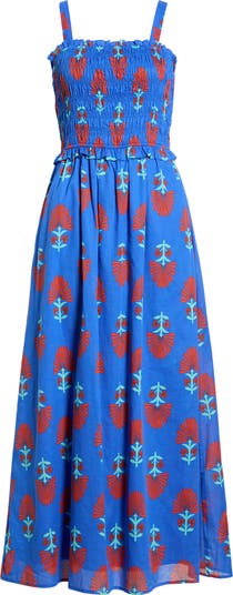 Vibrant hues pattern a sunny-day dress styled with a sweetly smocked bodice and cut from cool cotton.