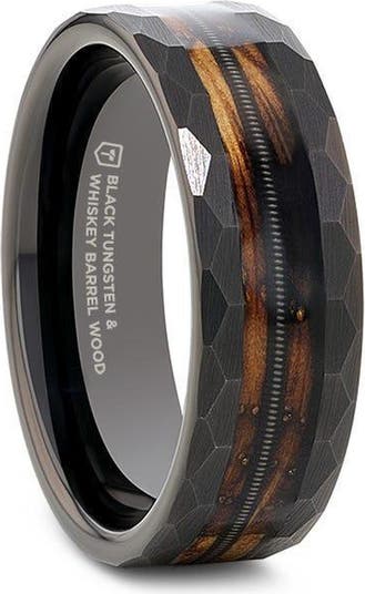 Riff Black Tungsten Ring features a unique blend of charred whiskey barrel wood and guitar string for an edgy look. Superior craftsmanship and timeless elegance.