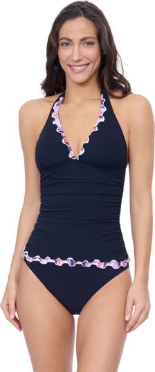 The Riga Tricolore Solid Halter Tankini showcases a chic design with delicate frill trim in a tricolor palette and a flattering halter neckline. Featuring Built in s