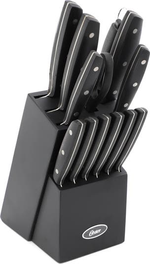 Elevate your kitchen experience with the Oster Riggins 14 Piece Stainless Steel Cutlery Set, a perfect blend of style and functionality. Crafted with precision-stamped blades that resist stains and rust, each knife promises durability and longevity. The full tang design ensures superior balance and strength, while the triple-riveted construction provides added stability for all your cutting tasks. The set includes a variety of knives, from chef's to paring knives, neatly housed in a sleek hardwood storage block that adds a touch of elegance to your countertop.Comfort is key in any kitchen, and the Oster Riggins knives feature ergonomic handles that provide a secure grip, allowing for effortless slicing, dicing, and chopping. Whether you're a culinary novice or a seasoned chef, this cutlery set meets all your cooking needs with ease. Enjoy the perfect fusion of quality, design, and performance, making meal preparation a joy rather than a chore. Upgrade your kitchen with the Oster Riggins 14 Piece Cutlery Set and experience the difference in every meal.