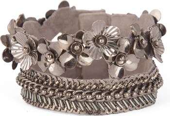 Intricate beading and dimensional flowers stand out on this hand-embellished bracelet that instantly creates a stunning stacked look.