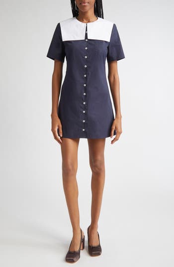 Liang puts her coquettish spin on everything she touches—including this retro cotton-poplin minidress sweetened with a contrast sailor collar and a neat row of lustrous mother-of-pearl buttons.