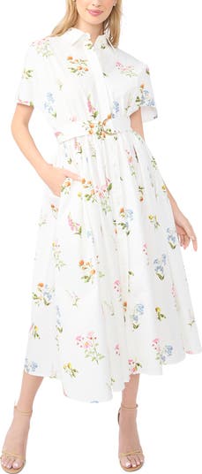 A garden of blooms brightens this airy cotton shirtdress featuring a neat collar, detachable belt and streamlined on-seam pockets.