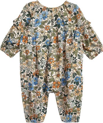 The Riley Romper is as delightful as it is practical for your little one's wardrobe. Crafted from soft, breathable fabric, it features an enchanting floral design in vibrant hues of blue, orange, green, and white on a beige background. Thoughtful touches like elasticized cuffs, ruffled shoulders, and a gently gathered waistline add playful elegance to this timeless piece, perfect for everyday wear or cozy outings. Fabric Content & Care 100% VISCOSE Machine Wash Cold | Line Dry | Do Not Bleach