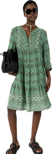 Adorned with a stylized geometric pattern, this short, straight dress offers a trendy and bohemian look. It is crafted from a fine and fluid material with a feminine drape and soft touch.