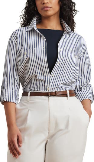 Yarn-dyed stripes create a nautical look for this relaxed-fit cotton button-up shirt, made with button-detailed patch pockets at the chest.