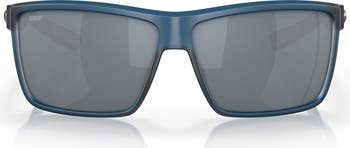 Rectangular sunglasses with sturdy wide temples boast polarized lenses to reduce glare and rubber insets at the nose pads and ear tips for comfort and grip.