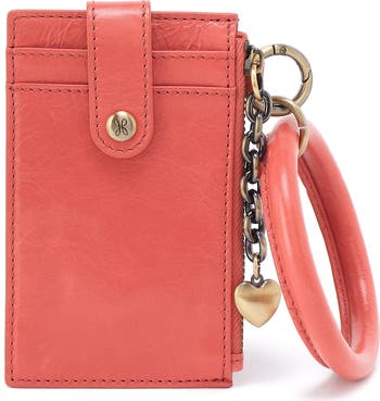 An optional ring handle offers added convenience to a slim leather case perfect for stashing your essential cards and coins.