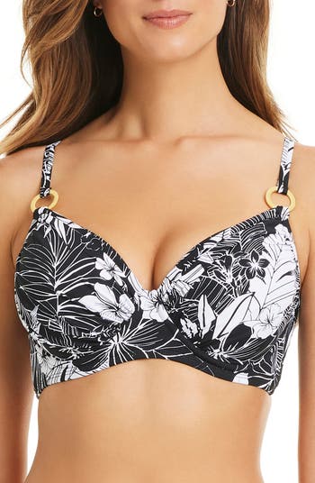 A ruched front adds flattering shape to this underwire bikini top framed with adjustable, ring-embellished straps for the perfect fit.