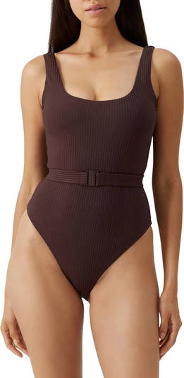 You'll be feeling confident as you lounge by the water in this ribbed one-piece swimsuit featuring a tonal belt that hugs your curves perfectly.