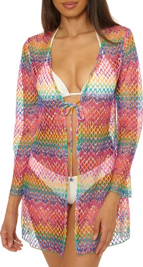 Becca Rio Fishnet Sheer Long Sleeve Cover-Up, Alternate, color, Pnk Multi