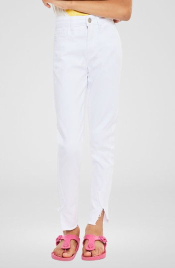 These skinny ankle jeans are the perfect back-to-school style to add to your closet. Made with our stretch denim it's made to feel comfortable all day long. Features a frayed hem, hidden elastic band with sewing button, 5-pocket style, single front button closure, and zip fly.