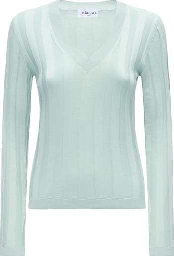 Rione is a vee neck sweater with long sleeves. It has a wide rib stitch. Made from Italian yarn of cotton and silk. Made in Italy